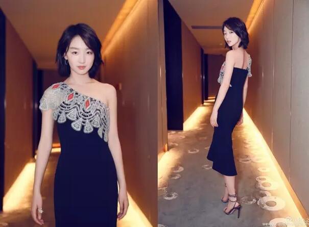 她还特别特别适合穿肩颈部有闪耀装饰的黑裙